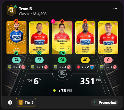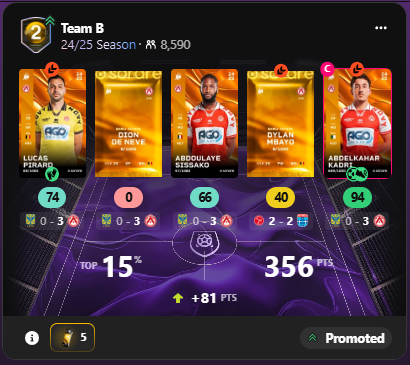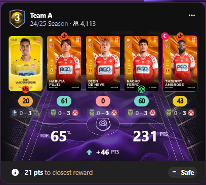 De In-Season competitie bracht wel succes! Team B pakte met 356 punten 5 essence, en dat met een speler minder, want Dion De Neve kwam niet in actie. Team A zat er ook dichtbij, met slechts 21 punten tekort. Ook hier speelde Dion De Neve niet, wat de score wellicht had kunnen verbeteren. Met essence kun je sparen om kaarten te craften, een mooie beloning voor een goede prestatie.