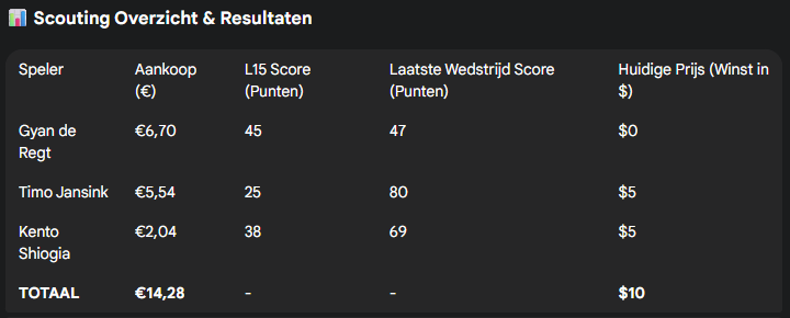 Resultaat: Een absolute "No-Brainer"! Timo had de voorkeur gekregen van de coach en met een L15 van 25 punten moest hij slechts 45 halen. Hij haalde een fenomenale 80 punten inclusief een geredde penalty. 🏆 $5 Binnen!